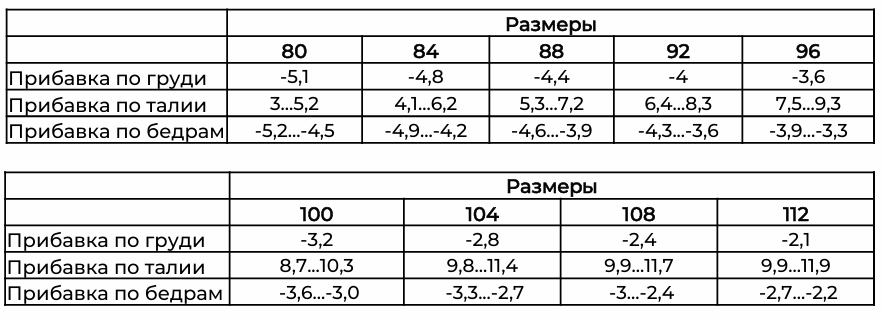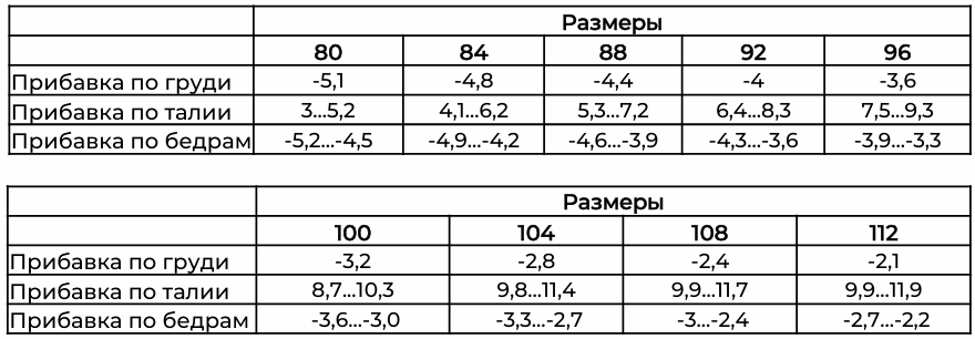 • Прибавки к полному обхвату (изменяется с увеличением размера и полнотной группы)