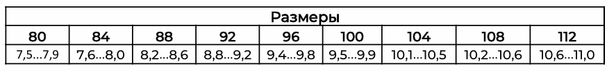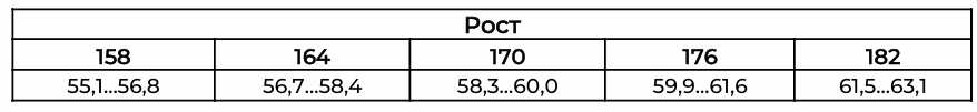 Рост 158 55,1 – 56,8 см Рост 164 56,7 – 58,4 см Рост 170 58,3 – 60,0 см Рост 176 59,9 – 61,6 см Рост 182 61,5 – 63,1 см